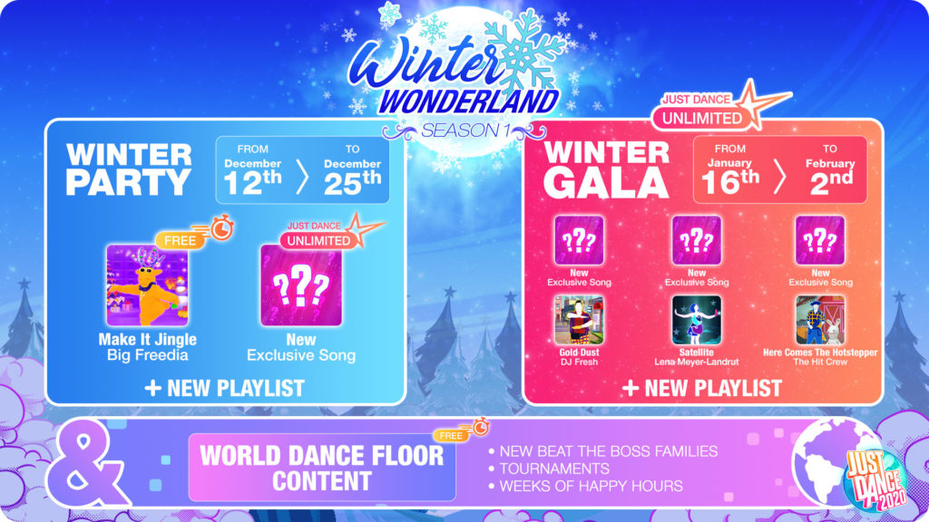 Zusammen mit der Veröffentlichung von Winter Wonderland, starten auf dem World Dancefloor, dem Online-Modus von Just Dance, kostenlose Feiertagsveranstaltungen. Spieler können sich Tänzern aus der ganzen Welt anschließen, um eine neue Boss-Familie zu besiegen oder an einem Winterturnier teilzunehmen.