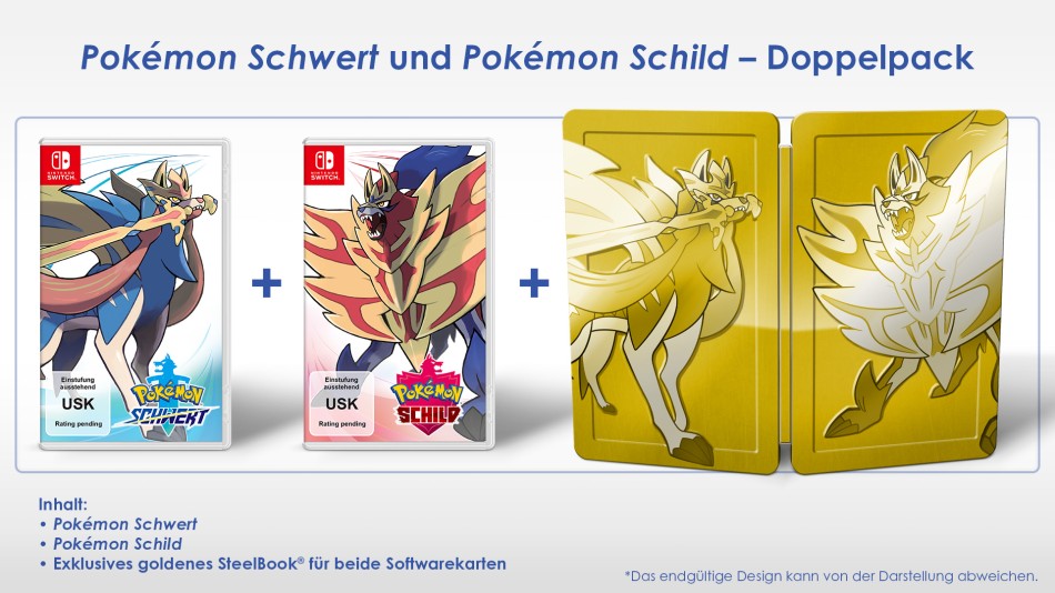 Am selben Tag erscheint auch das Doppelpaket zu Pokémon Schwert und Pokémon Schild, das beide Spiele und ein exklusives goldenes SteelBook mit Platz für beide Softwarekarten enthält!