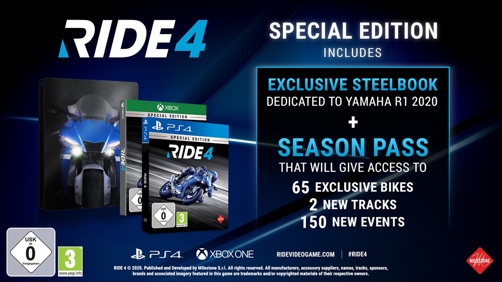Zeitgleich mit der Veröffentlichung des neuen Trailers stellt Milestone ebenfalls die neue physische RIDE 4 Special Edition für PlayStation 4 und Xbox One vor, die ein Steelbook enthält, das der Yamaha R1 2020 gewidmet ist. Die Version beinhaltet zudem den Season Pass, der 65 neue Bikes, zwei neue Strecken und 150 neue Events für die Fans bereit hält.